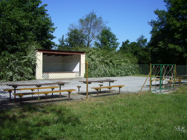 3. Za drzewami, po prawej stronie, znajduje się boisko do gry w piłkę nożną. Stąd często rozlega się gwar bawiącej się młodzieży. To miejsce spotkań młodych, wiejskich sportowców. Natomiast po stronie lewej ciągnie się rząd młodych kilkunastoletnich robinii akacjowych.