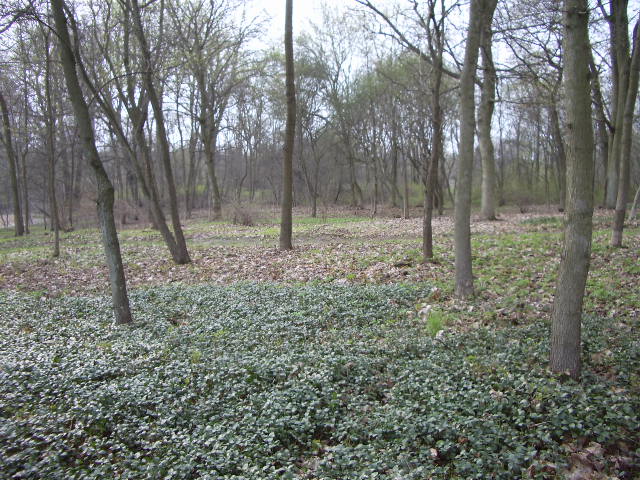 13. Po ominięciu polan dalszy ciąg alejki wprowadza nas w zarośla. Z prawej strony alejki rosną młode wiązy i klony, z lewej czarny bez, a u jego "stóp" rozciągają się kolejne połacie barwinka.