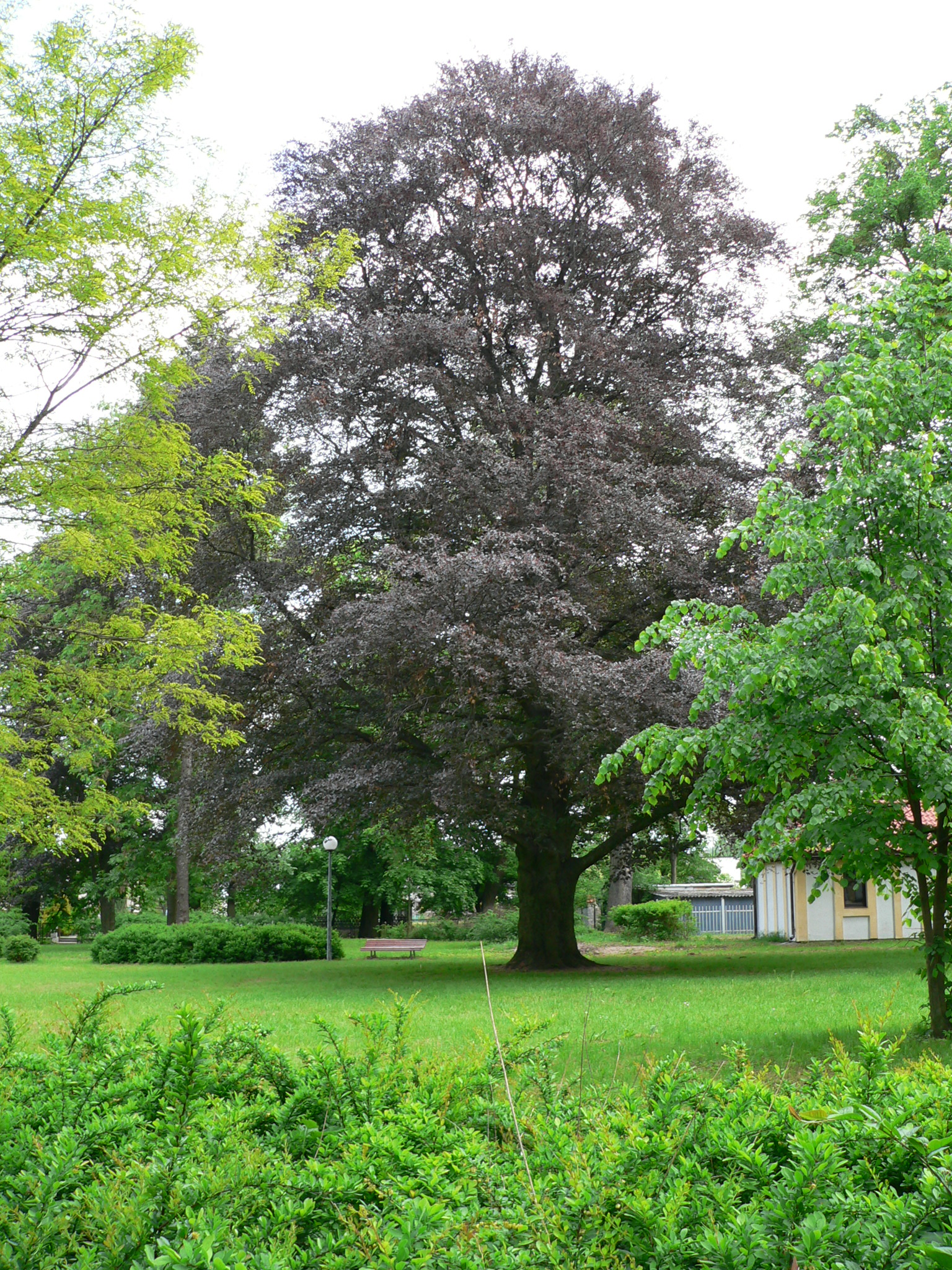 W dalszej części podążamy alejką w dół, w kierunku zachodnim. Około 20 m od pałacu rosną dwa potężne pomniki przyrody: buk czerwony, którego obwód sięga 3 m oraz lipa. Po prawej stronie alejki w oddali widać niebanalny, bardzo wysoki jesion.