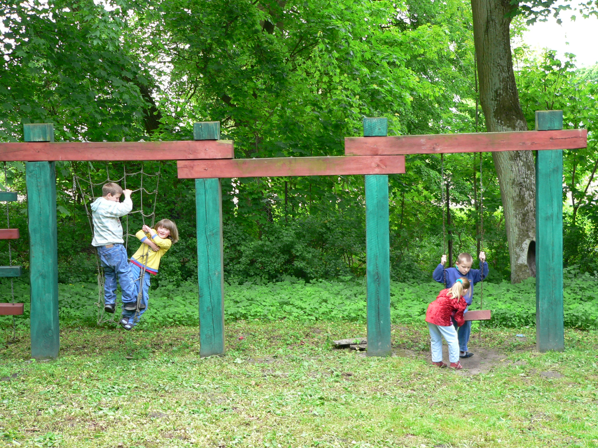 Dzieci mają do dyspozycji wieloosobowe huśtawki, koniki na sprężynach, dużą piaskownicę, stół do tenisa, "małpi gaj" z torem przeszkód i zjeżdżalnią oraz w okresie letnim rozkładany basen. Za placem zabaw usytuowane jest boisko sportowe. Wokół niego rośnie wiele jesionów i innych gatunków drzew.