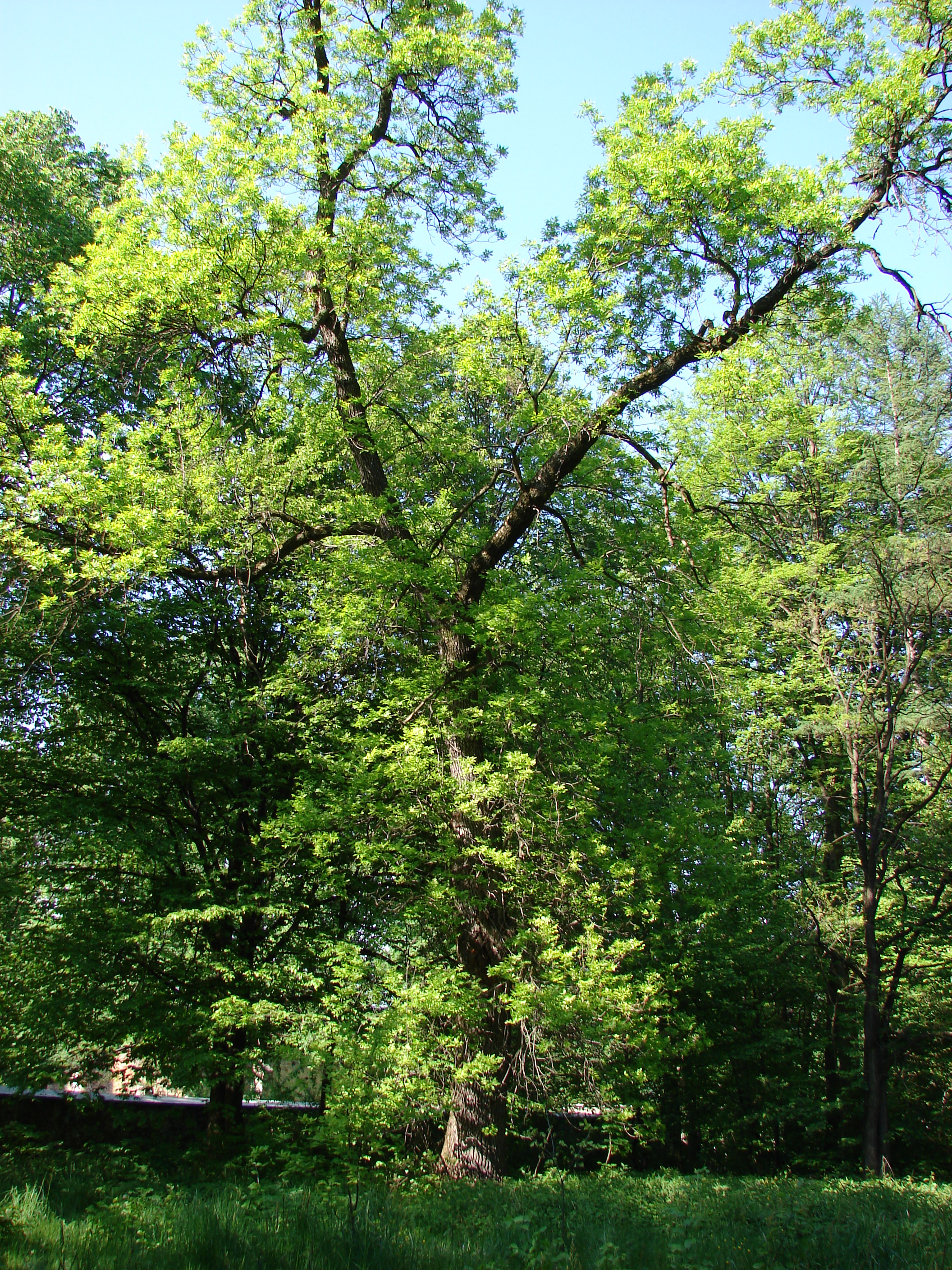 Po drugiej stronie brukowanej drogi rosną dwa potężne dęby szypułkowe (Quercus robur): pierwszy bliżej drogi o obwodzie 388 cm i wysokości 32 m, drugi, przy ogrodzeniu, jest w parku drzewem o największym obwodzie - 408 cm. i mierzy 30m. Schodząc dalej drogą w dół mijamy orzech czarny (Juglans nigra) o obwodzie 195 cm i wysokości 29 m. Ma on kuliste owoce średnicy 3-5 cm, o szerokiej i silnie aromatycznej zewnętrznej, zielonej okrywie. Łupina orzecha jest gruba, bruzdowana, czarno-brązowa. Orzechy dojrzewają we wrześniu. Pochodzi ze wschodniej części Stanów Zjednoczonych.