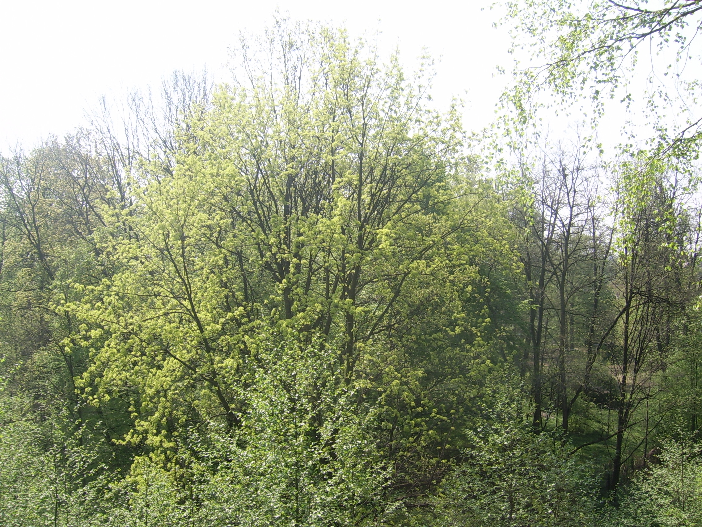 12. Idziemy dalej w kierunku wschodnim. Skręcamy w prawo, w ścieżkę prowadzącą do równie zaskakującego okazu przyrody. Jest nim klon pospolity o obwodzie 345 cm. Ciekawostką biologiczną jest obecność w ogonkach liści przewodów mlecznych, z których wypływa sok mleczny. Swoim wyglądem przypomina kilka rosnących ze sobą okazów. Od jego pnia odrastają cztery konary. W przyszłości kiedy ich wiek się zwiększy, może się rozerwać, gdyż każda część tego pięknego okazu będzie się kierować w swoją stronę.