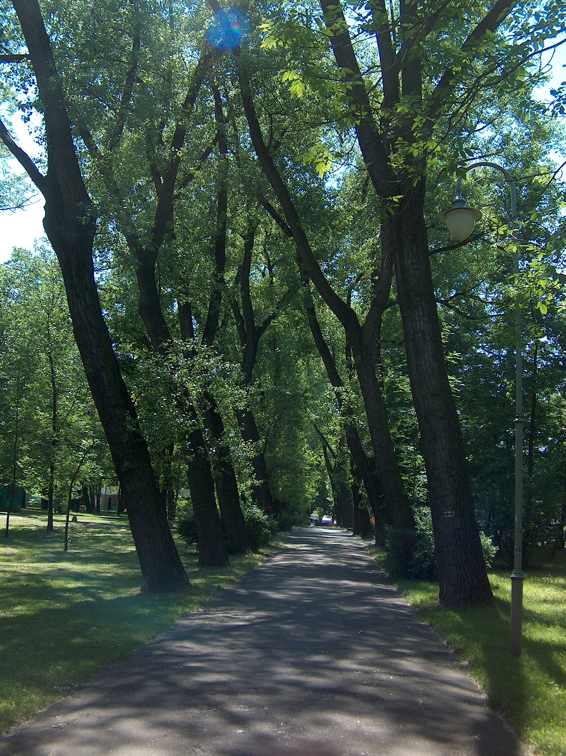 Ścieżka dydaktyczna zaczyna się przy głównym wejściu od ul. Kościuszki. Idąc prosto w kierunku wieży spadochronowej po obu stronach alei możemy zobaczyć duże okazy wierzby płaczącej (Salix chrysocoma), zawdzięczającej swoją nazwą charakterystycznym, zwisającym gałęziom, jak również kasztanowca zwyczajnego (Aesculus hippocastanum). Trawnik jesienią zawsze jest przeszukiwany przez dzieci w poszukiwaniu kasztanów. Przed wieżą spadochronową skręcamy w lewo, na południe i idziemy prosto. Mijając restaurację “Zielone oczko” warto zwrócić uwagę na piękne stare graby (Carpinus betulus).