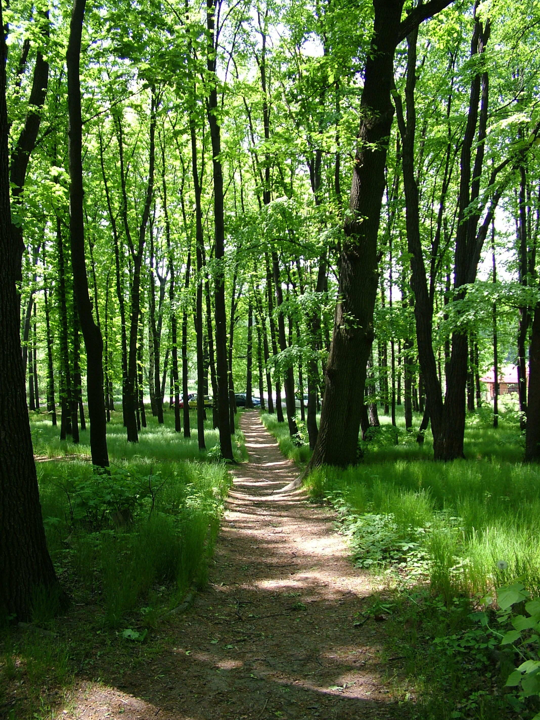 1. Trasę wycieczki rozpoczynamy od wejścia do parku od strony północnej, przy ulicy Parkowej. Rosną tu wysokie dęby i graby, które zapewniają cień i dobre miejsce na zbiórkę. Przed widać schody wiodące pod górę w głąb parku i które można wykorzystać do rozgrzewki. Zwracamy uwagę na rosnące po prawej stronie rosochate graby z charakterystycznymi pokrzywionymi pniami.