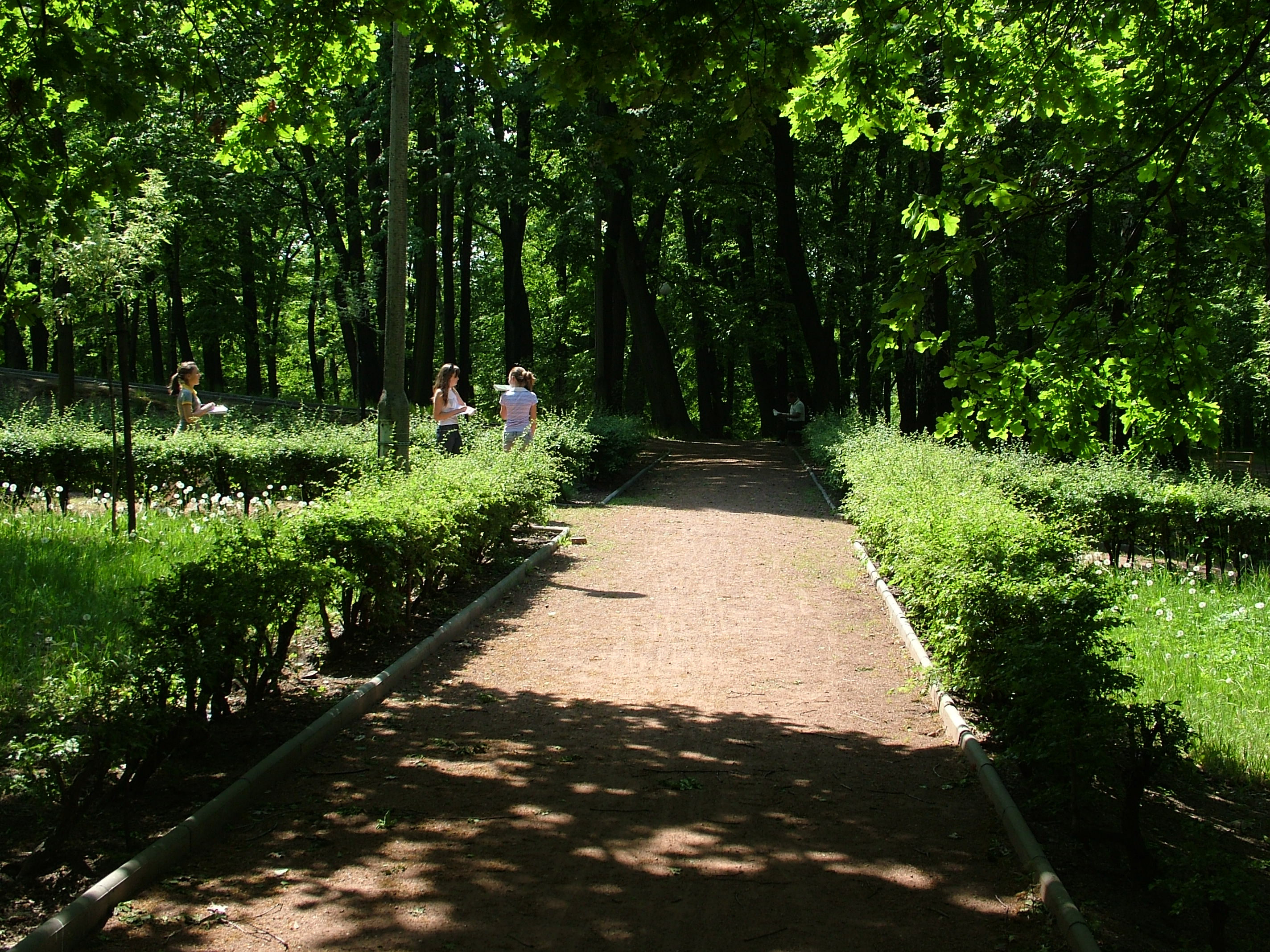 13. Kierujemy się na północny zachód. Po lewej stronie mijamy szpaler młodych dębów szypułkowych i lip drobnolistnych. Jest to teren bardziej nasłoneczniony w parku, w bliskim sąsiedztwie ogródków działkowych. Po prawej stronie widzimy największy w parku okaz buka pospolitego czerwonolistnego. Zbudowano tutaj metalowe rurki do wykonywania podciągnięć na rękach.