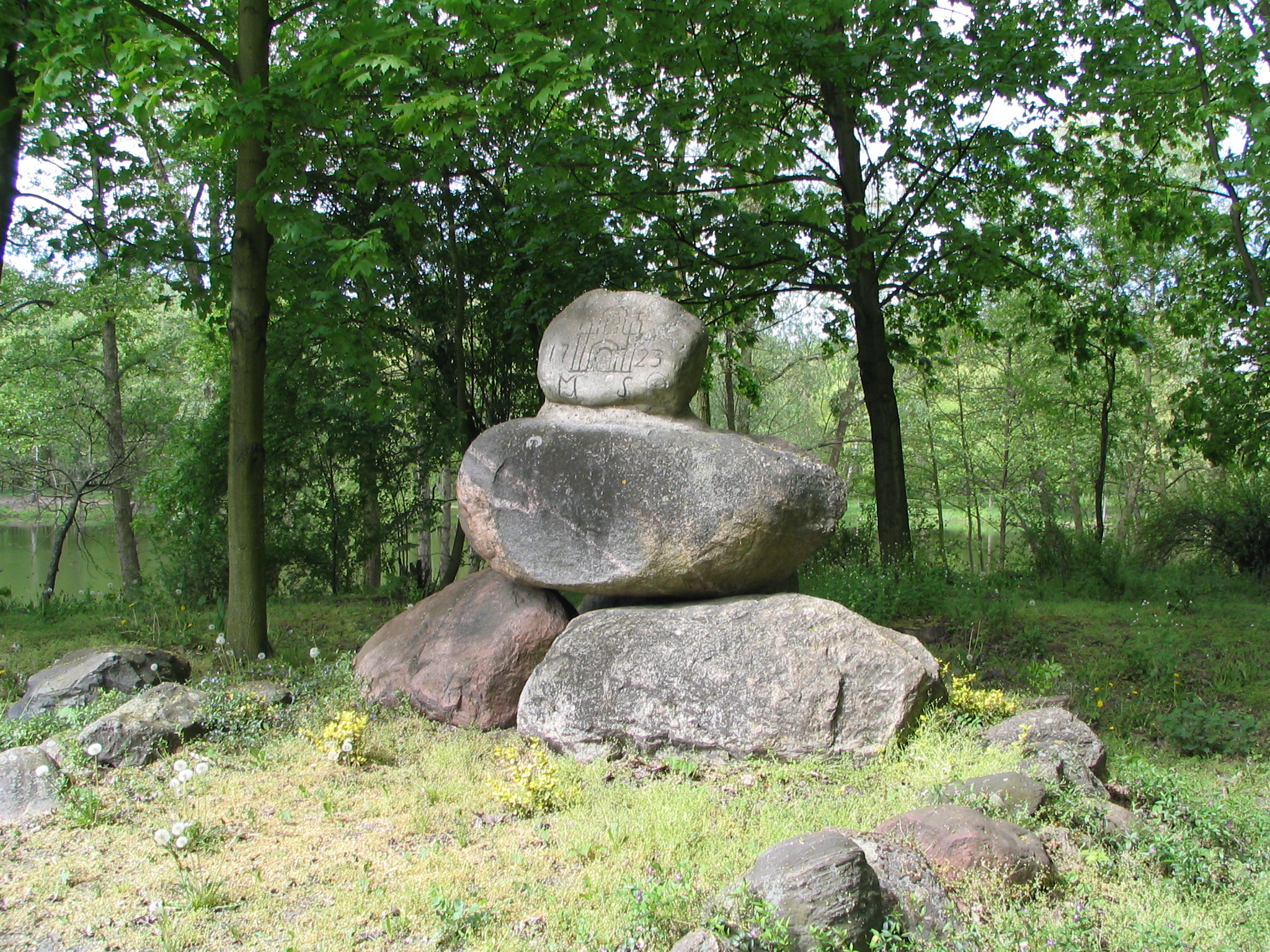 15. Idąc dalej ścieżką wiodąca wzdłuż lewego brzegu stawu dochodzimy do niewielkiego wzniesienia. Wśród bujnej zieleni znajduje się kamień graniczny z 1723 r. Prawdopodobnie jest to jeden z kamieni wyznaczający niegdyś teren należący do zakonu franciszkanów.