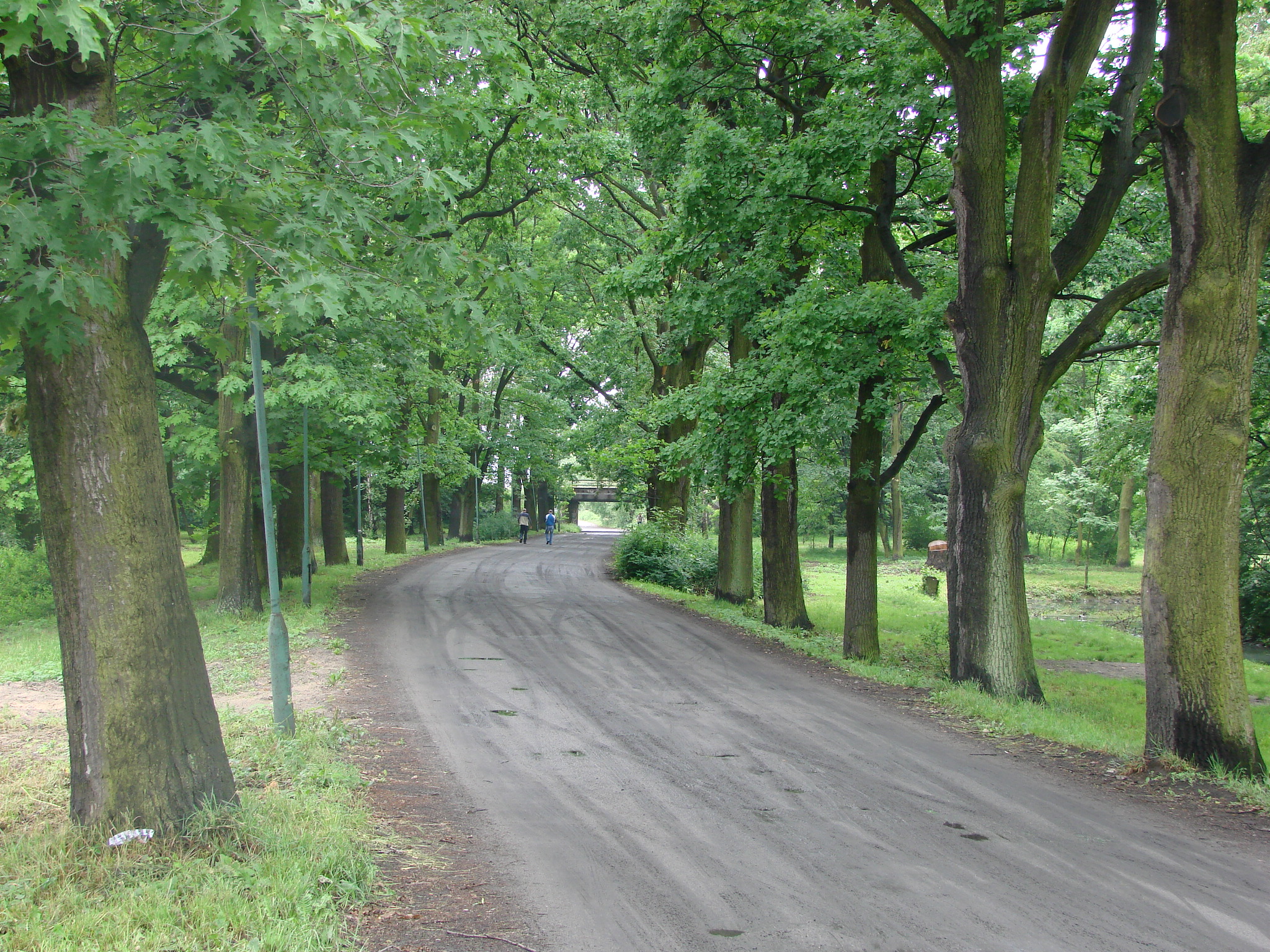 1. Naszą przechadzkę rozpoczynamy od wejścia na ul. Spacerową. Po prawej stronie znajduje się wysepka otoczona stawem. Za stawem znajduje się rozległa polana ograniczona od wschodu aleją dębową. Ten widok wprowadza miły nastrój już na progu naszej wycieczki.