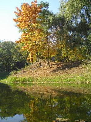 16. Dochodzimy do dworku modrzewiowego. Skręcamy w alejkę prowadzącą wokół stawu, na którego środku znajduje się wyspa - miejsce lęgowe łabędzia niemego oraz kaczki krzyżówki. Po przejściu 60 m od dworku zatrzymujemy się przy modrzewiu europejskim.